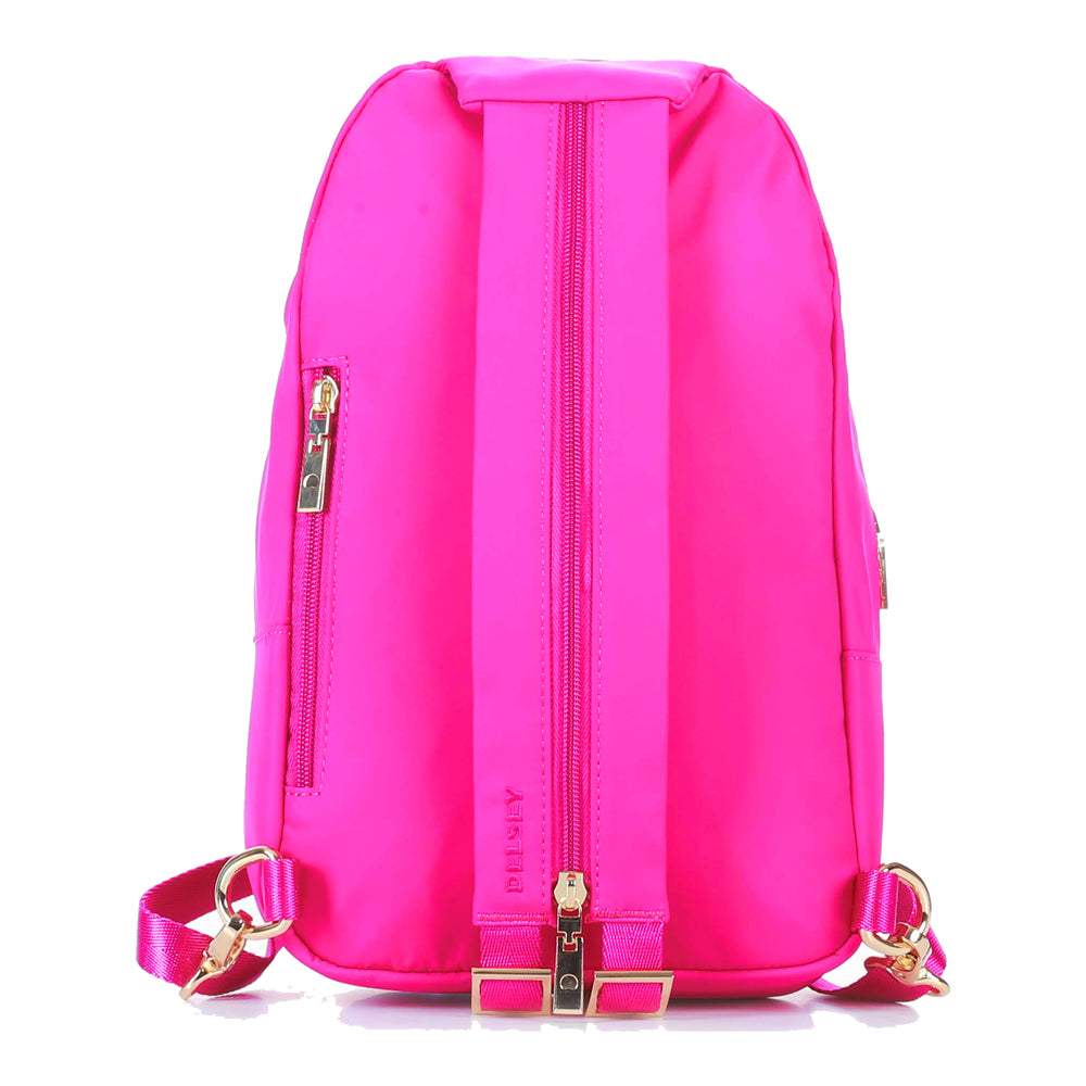 Mochila porta netbook. Con correa convertible para llevarla como mochila o como cartera cruzada. Maeterial principal repelente al agua. Bolsillo con forro anti RFID para bloquear escaners y robo de datos. Varios bolsillos en el exterior e interior. Bolsillo escondido en la parte posterior. Organizador en el interior y aro para colgar llaves. Herrajes dorados. Material: nylon.