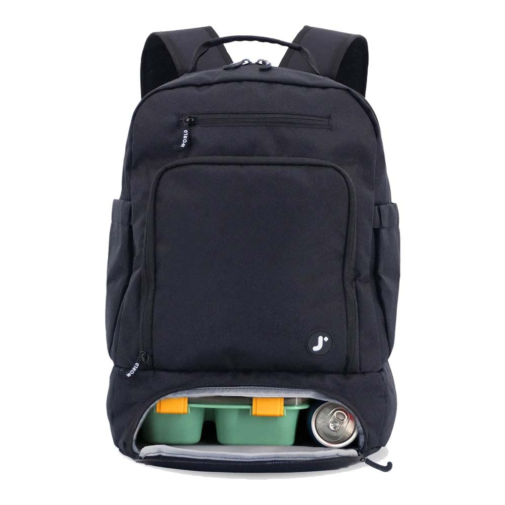 Mochila con lunchera térmica incorporada 3 amplios compartimientos que permiten guardar laptop, tablet, libros y más Dos bolsillos laterales expandibles para botellas Gran bolsillo frontal con cierre Correas acolchadas y ajustables con costuras reforzadas y hebilla Bolsillo adicional con cierre