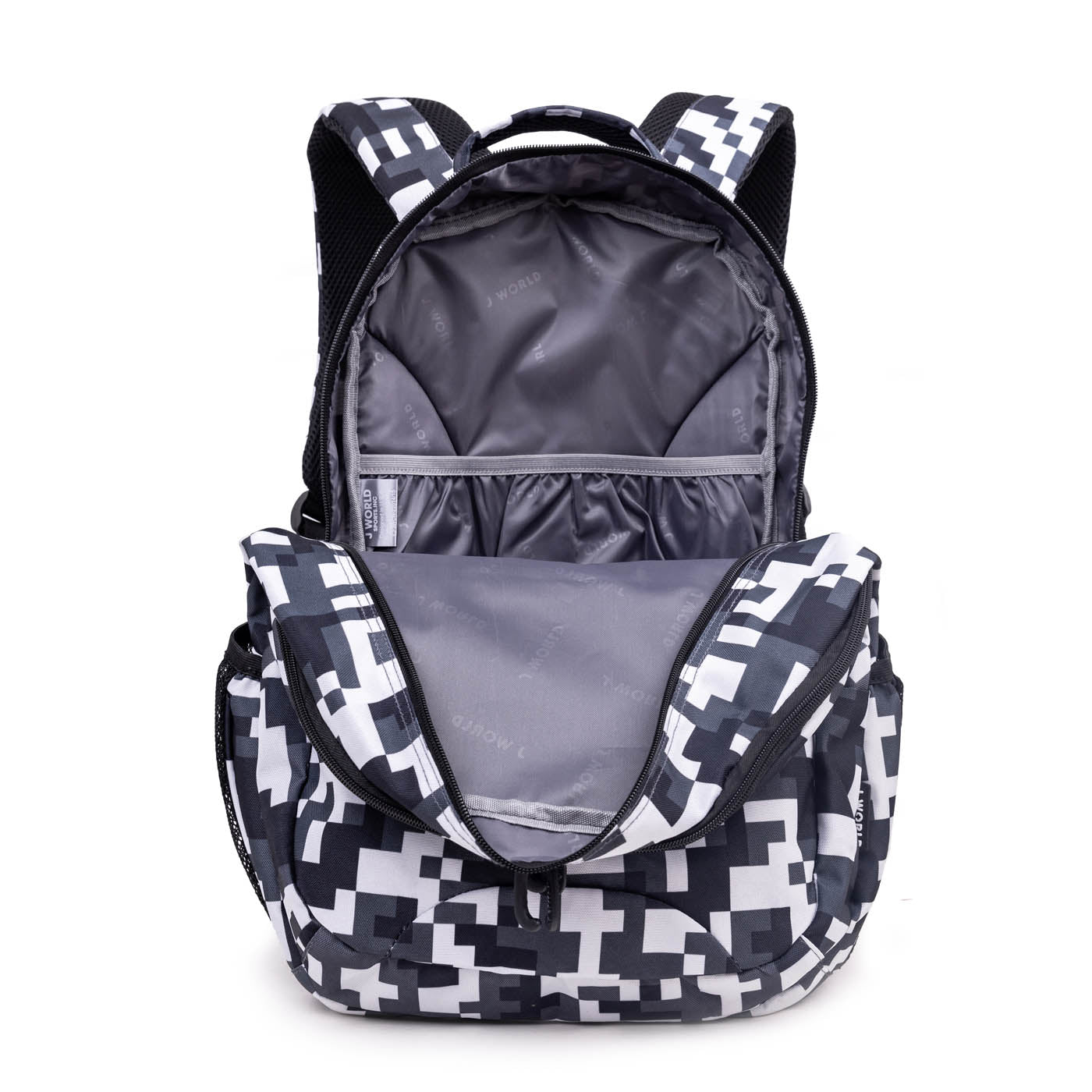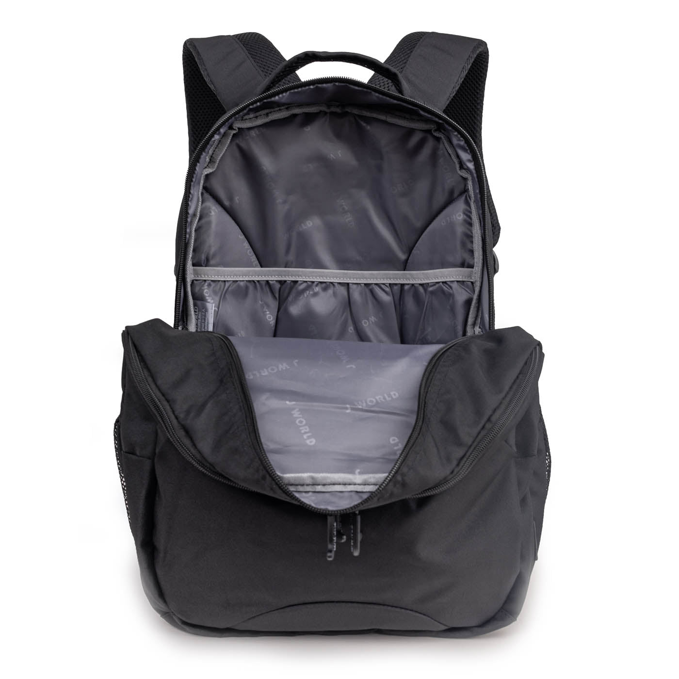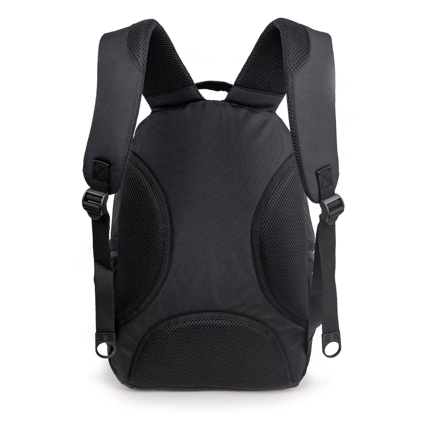 Respaldo acolchado para mayor comodidad Bolsillo para laptop en el compartimento principal Bolsillo frontal utilitario y bolsillos laterales para botella de agua Tirantes ergonómicos en forma de “S” Asa superior y tirantes acolchados con malla de aire Tres compartimentos diferentes para espacio de guardado adicional Tela resistente al agua 600D con recubrimiento de PU
