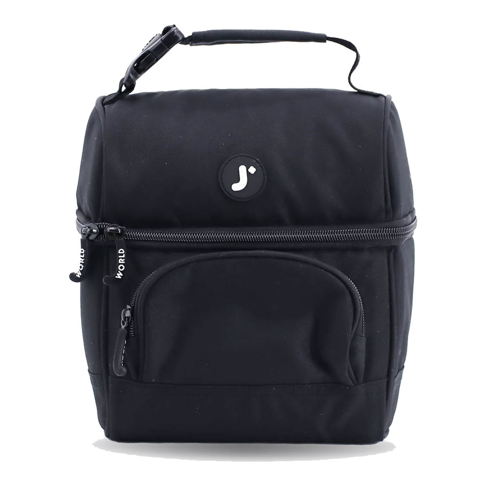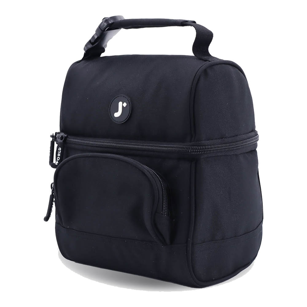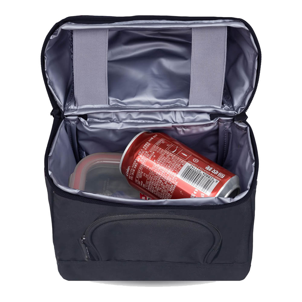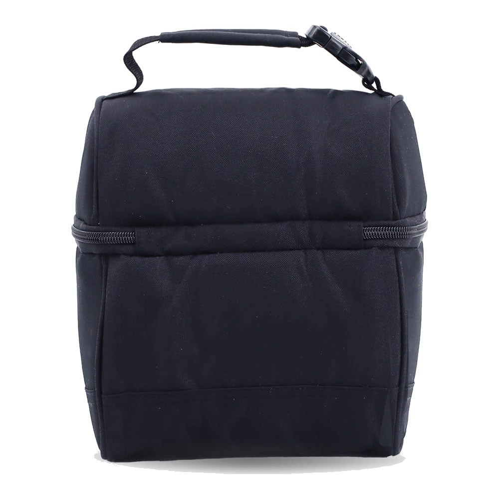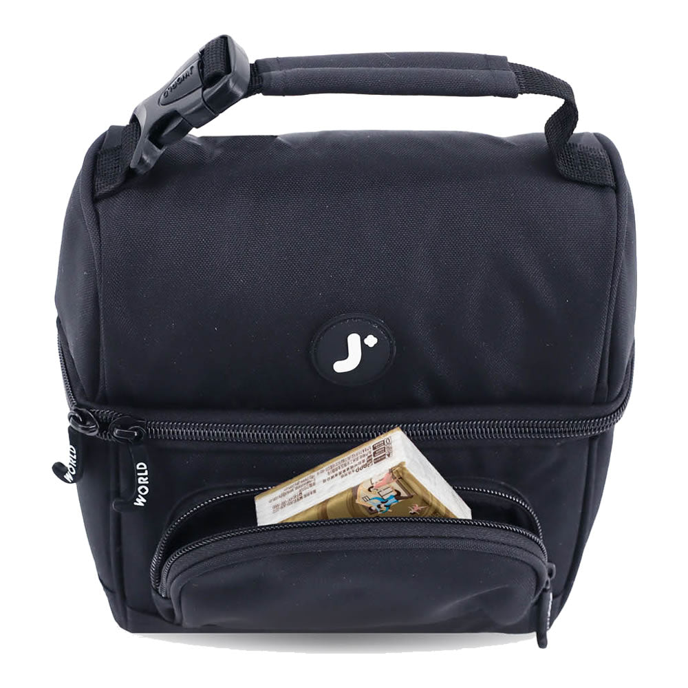 Compartimento principal para contenedores de comida Bolsillo frontal para cubiertos Asa superior con hebilla Correa interior para sujetar botella de agua Asa con hebilla para sujetar a una mochila