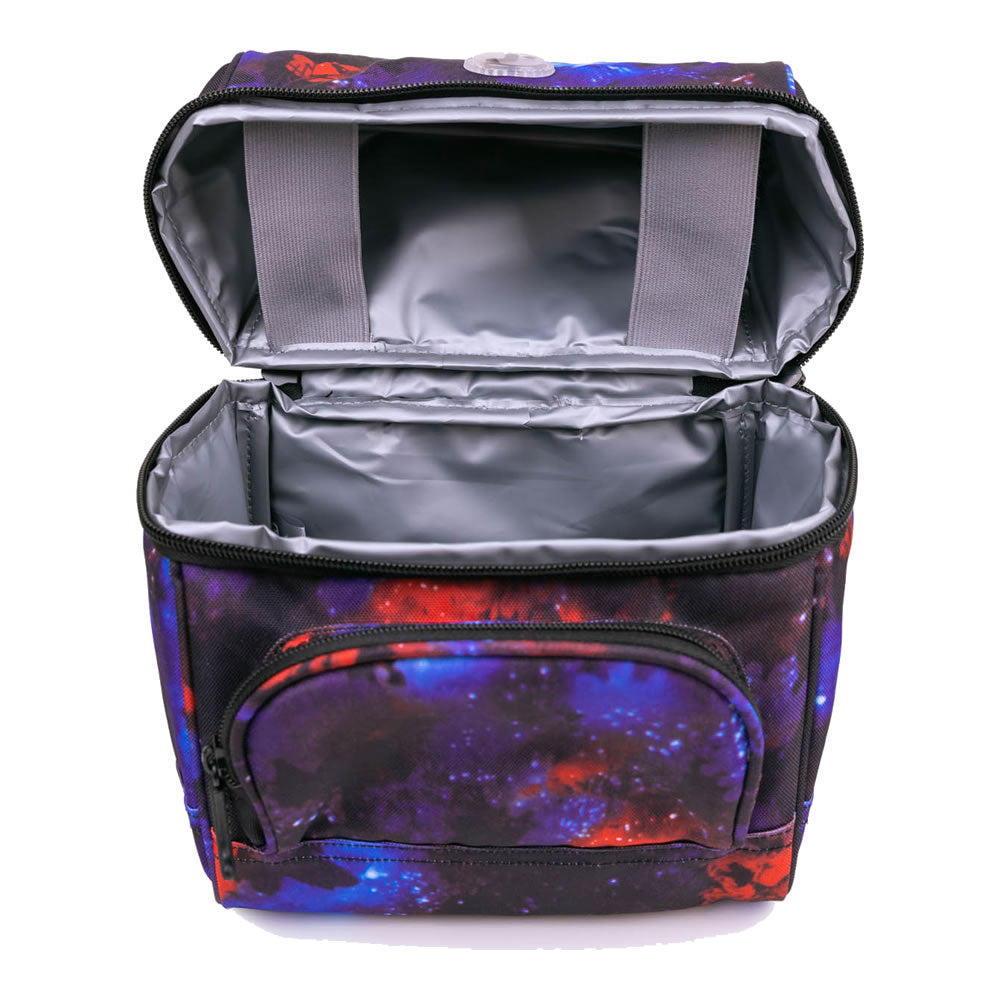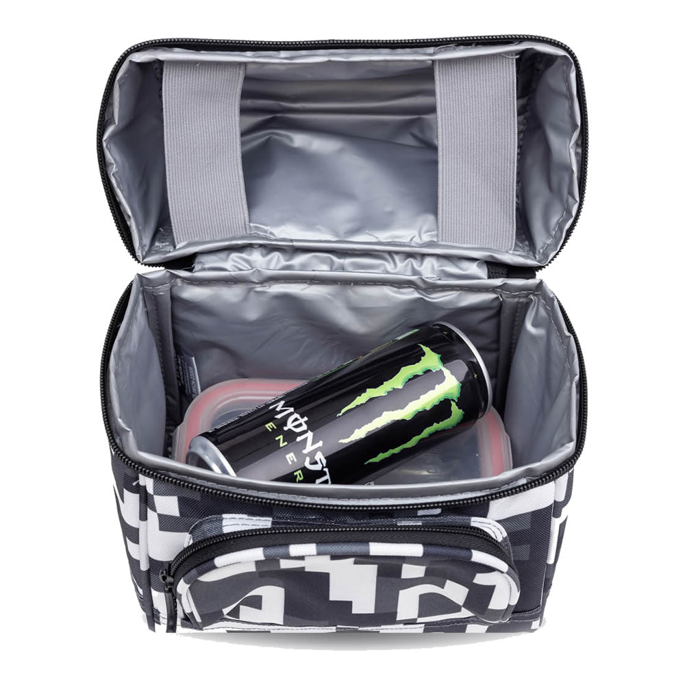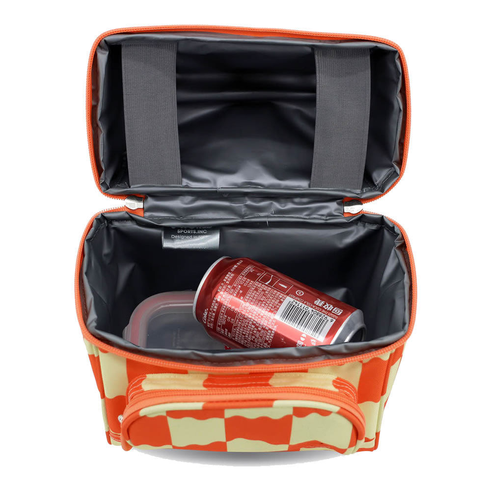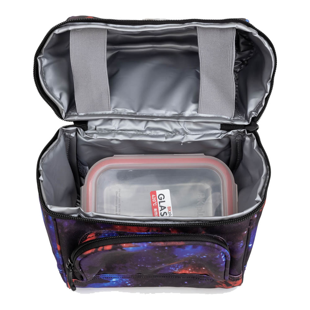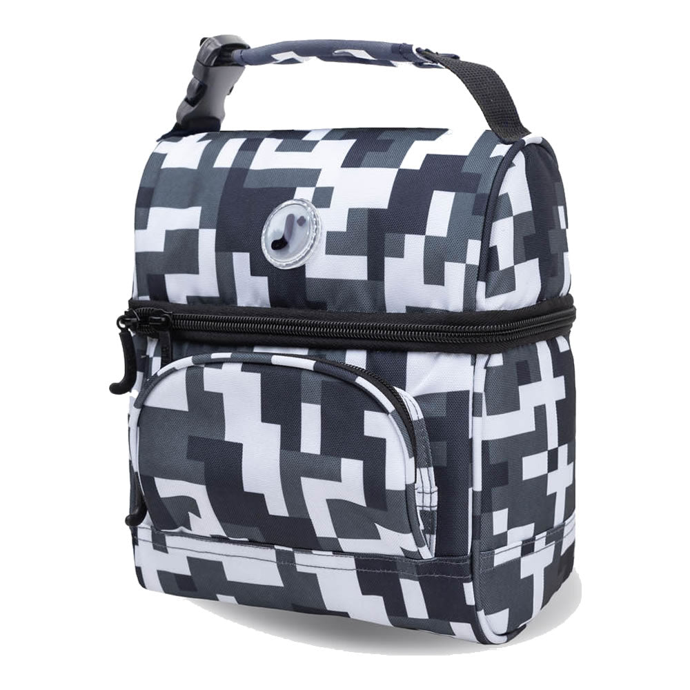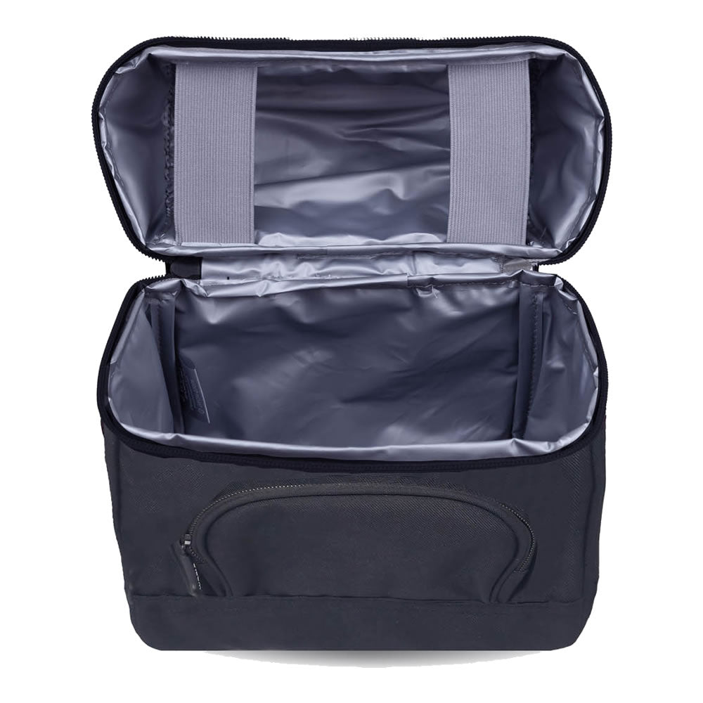 Compartimento principal para contenedores de comida Bolsillo frontal para cubiertos Asa superior con hebilla Correa interior para sujetar botella de agua Asa con hebilla para sujetar a una mochila