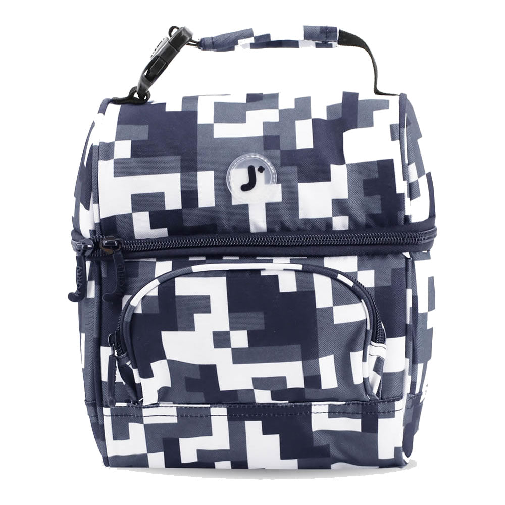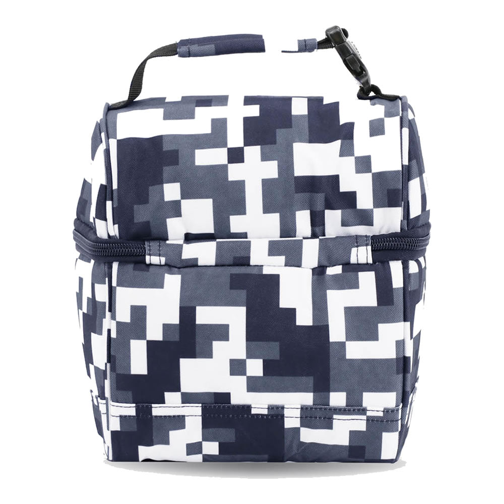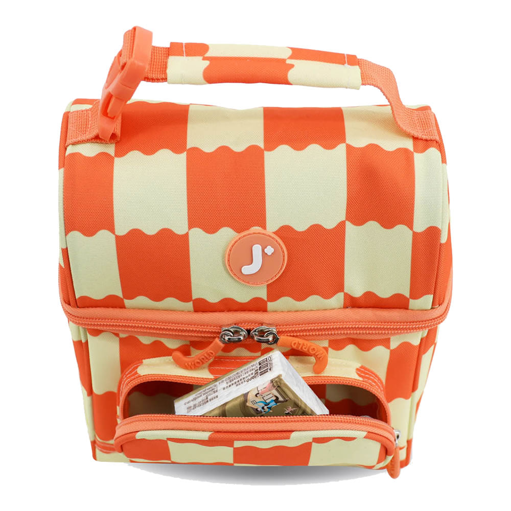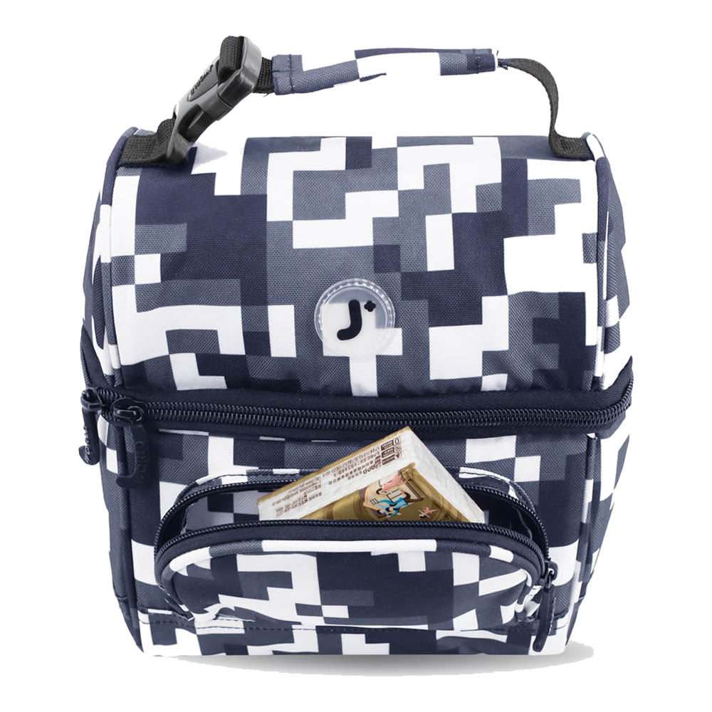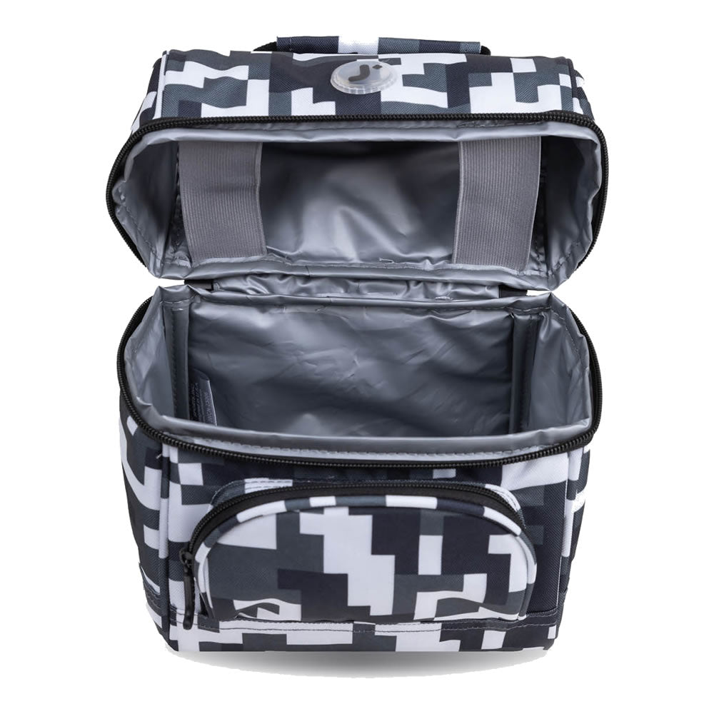 Compartimento principal para contenedores de comida Bolsillo frontal para cubiertos Asa superior con hebilla Correa interior para sujetar botella de agua Asa con hebilla para sujetar a una mochila