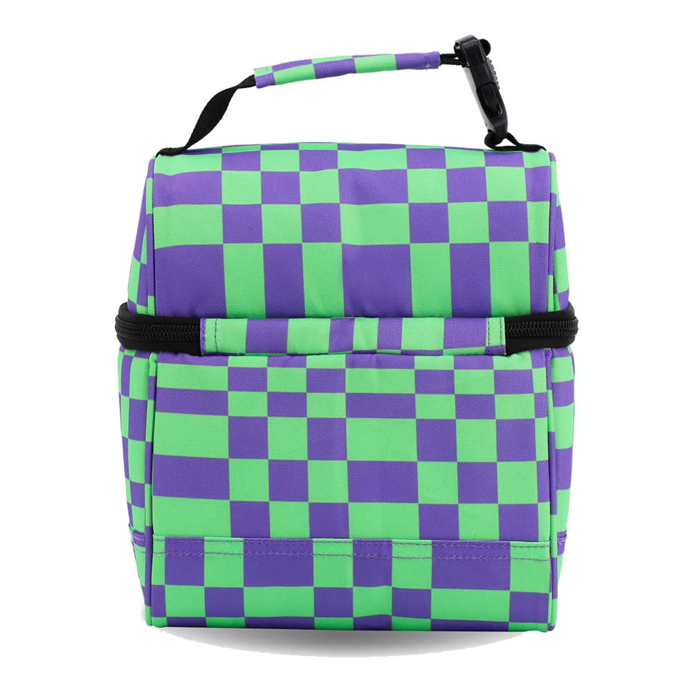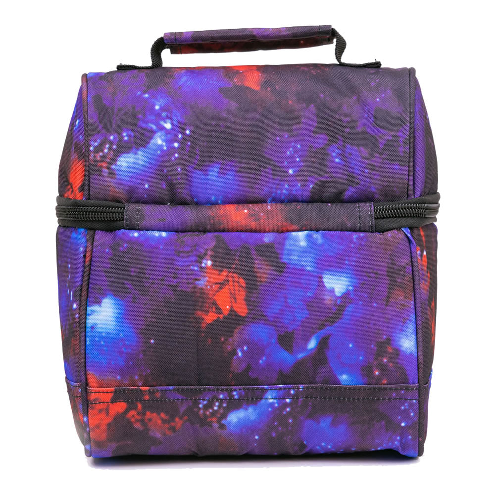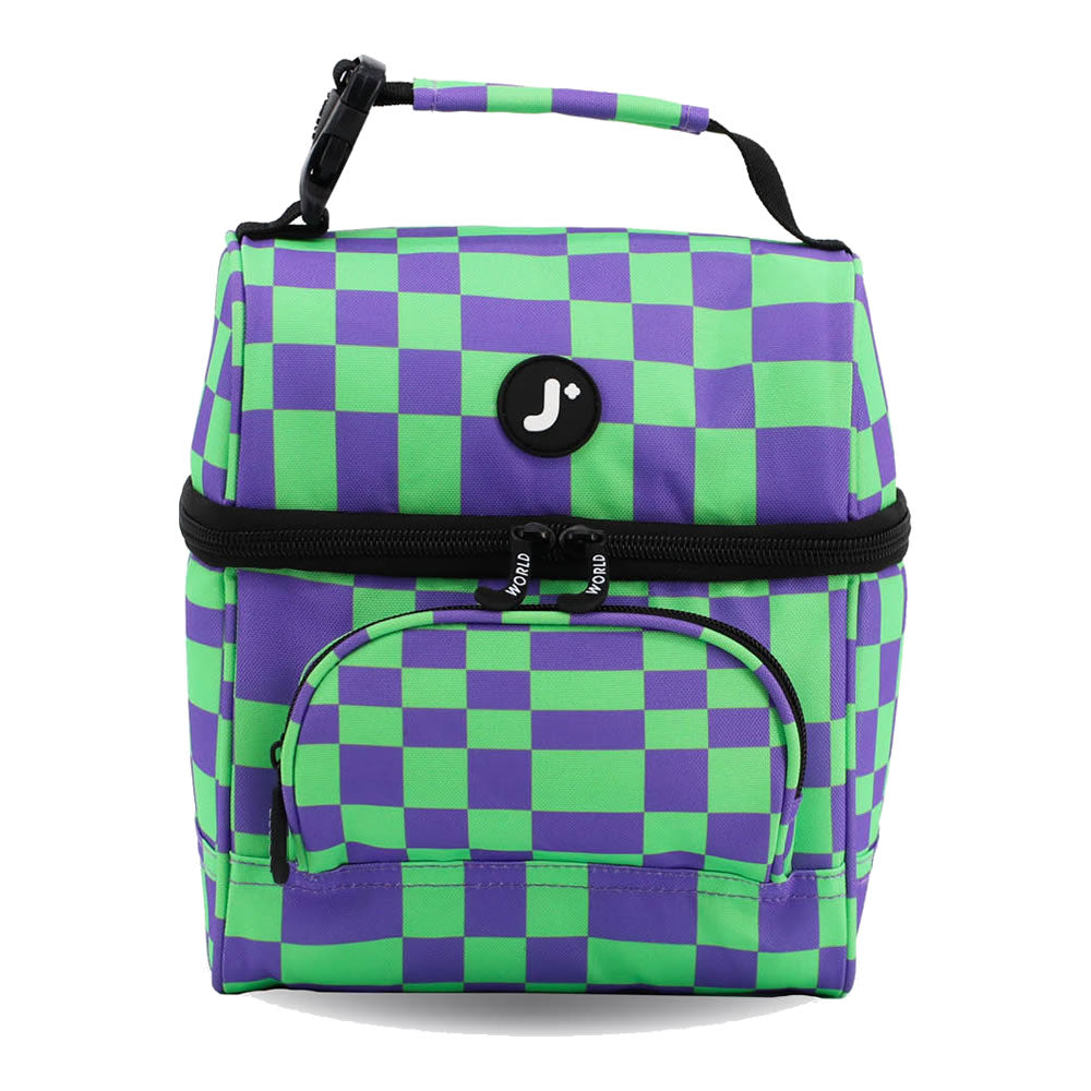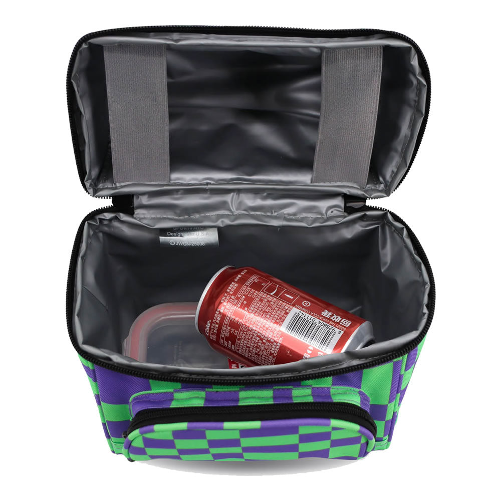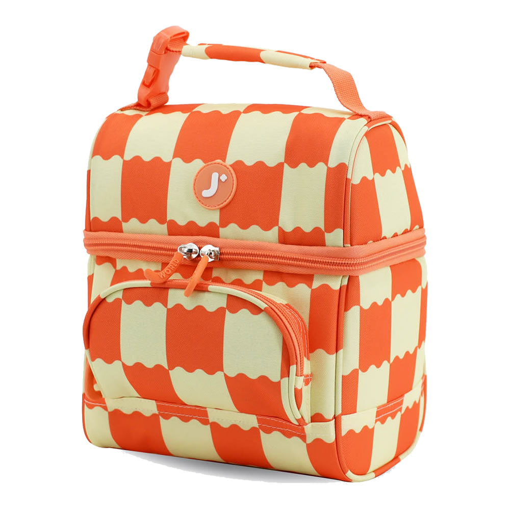 Compartimento principal para contenedores de comida Bolsillo frontal para cubiertos Asa superior con hebilla Correa interior para sujetar botella de agua Asa con hebilla para sujetar a una mochila