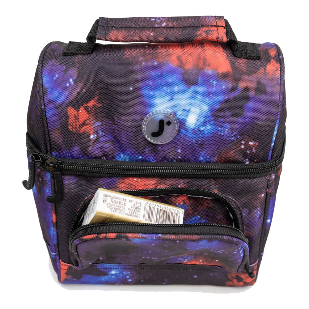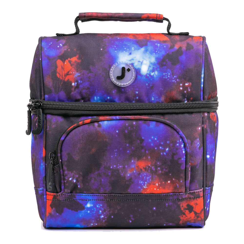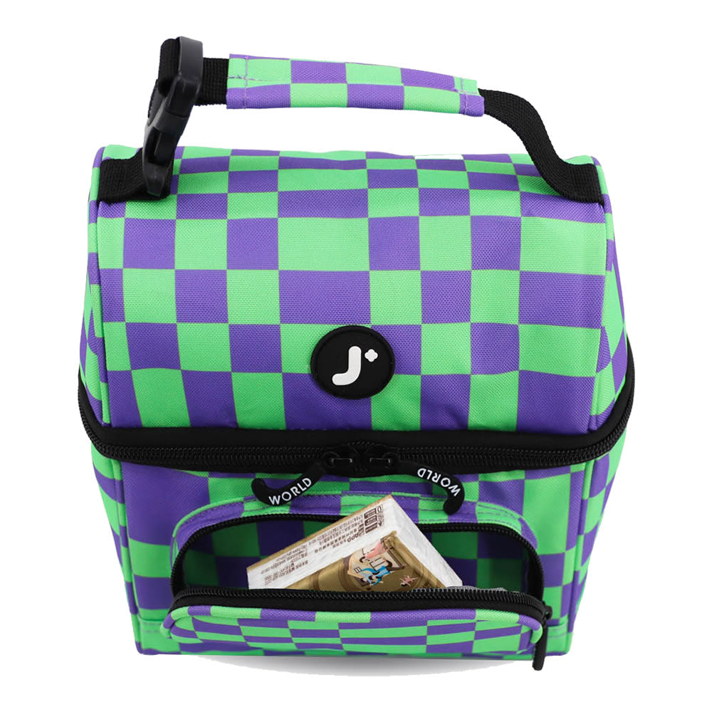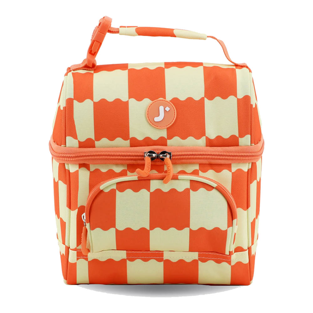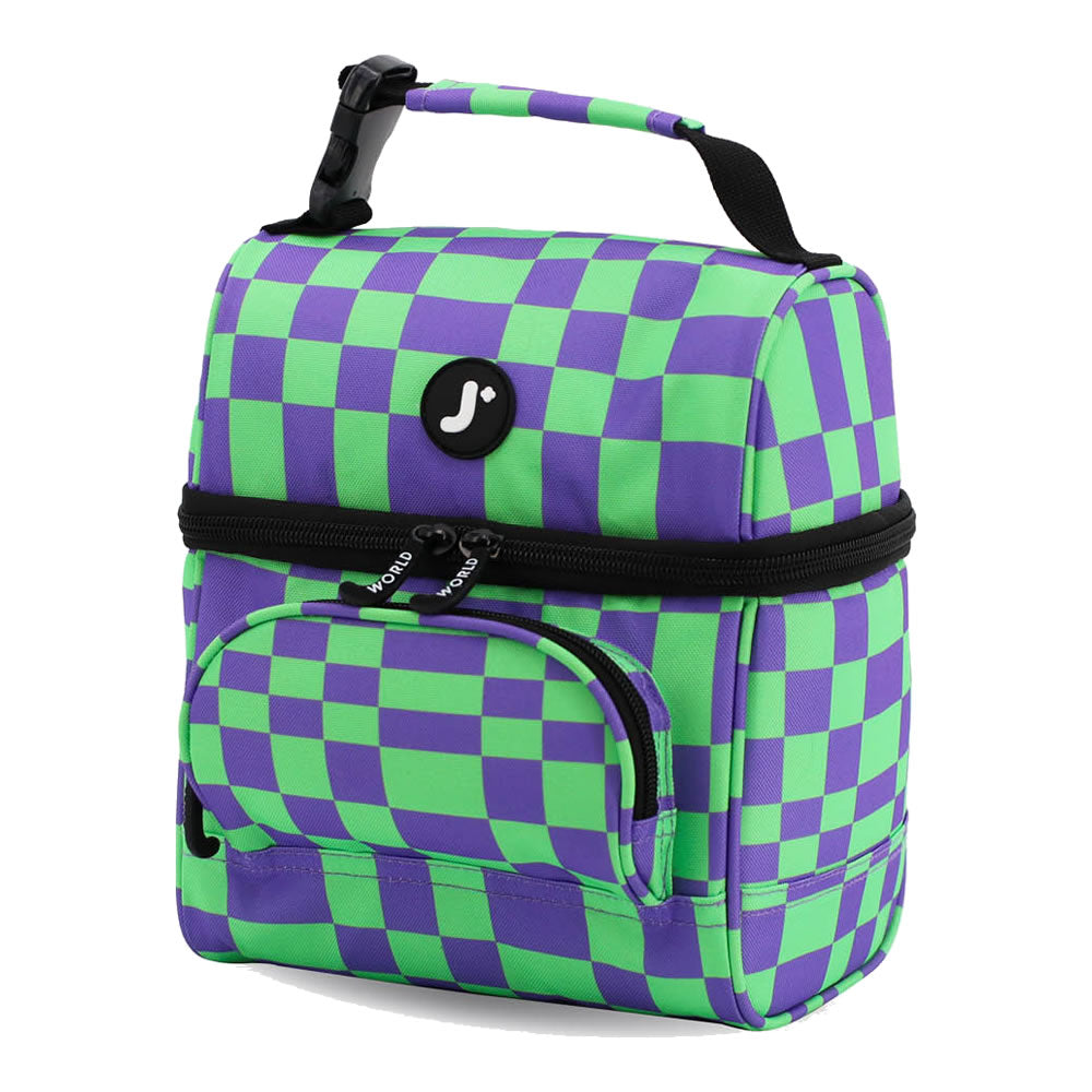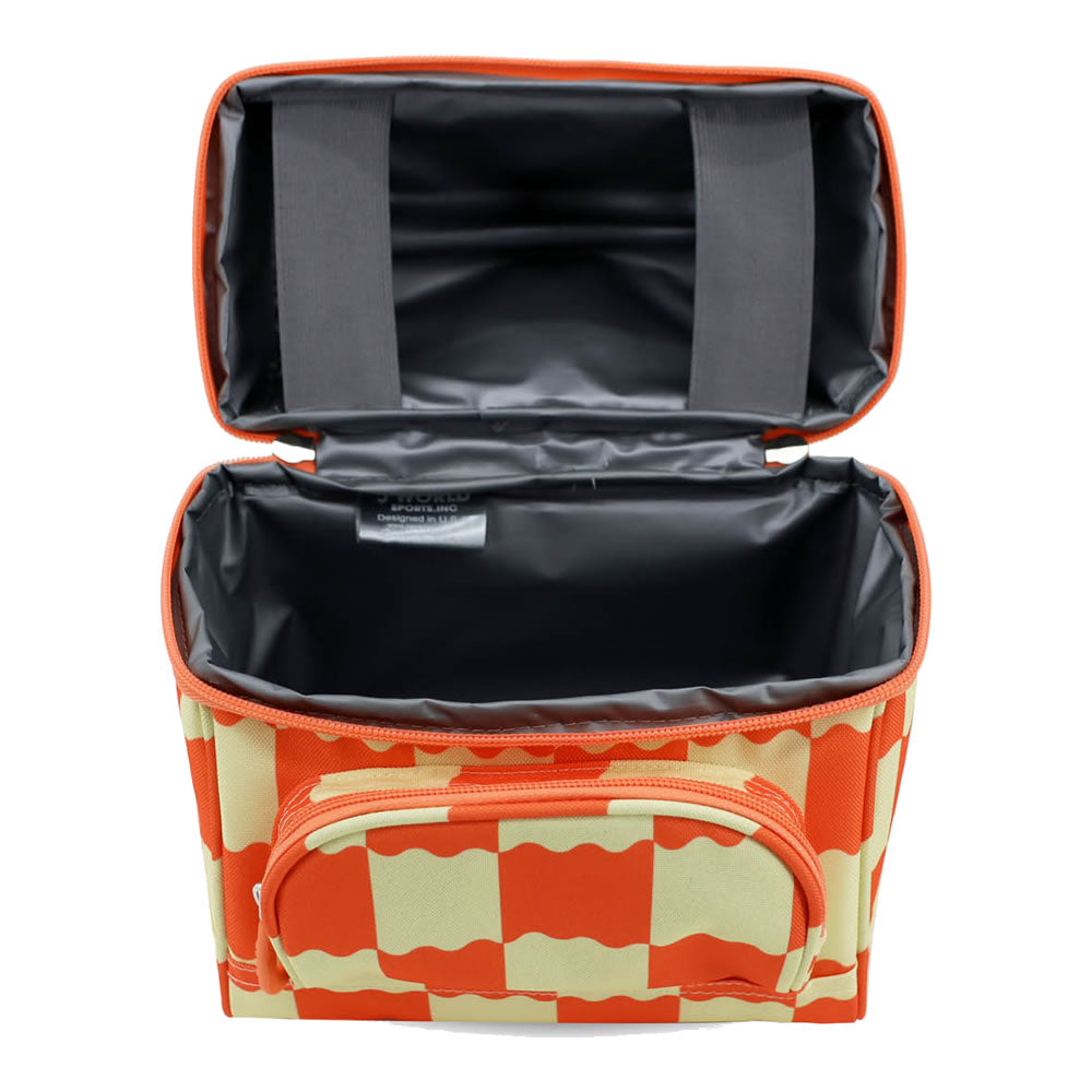 Compartimento principal para contenedores de comida Bolsillo frontal para cubiertos Asa superior con hebilla Correa interior para sujetar botella de agua Asa con hebilla para sujetar a una mochila