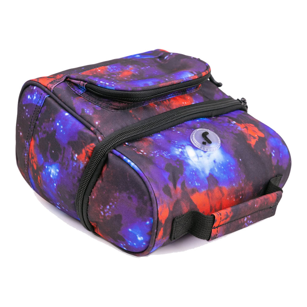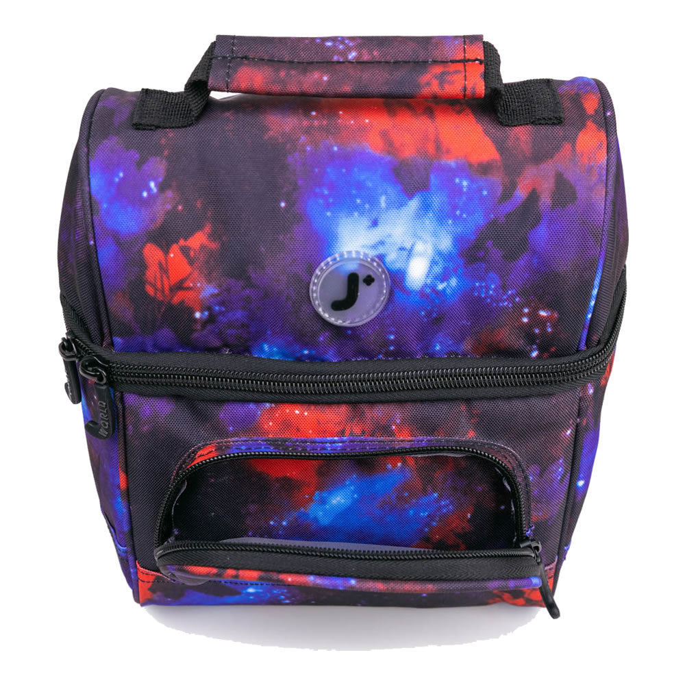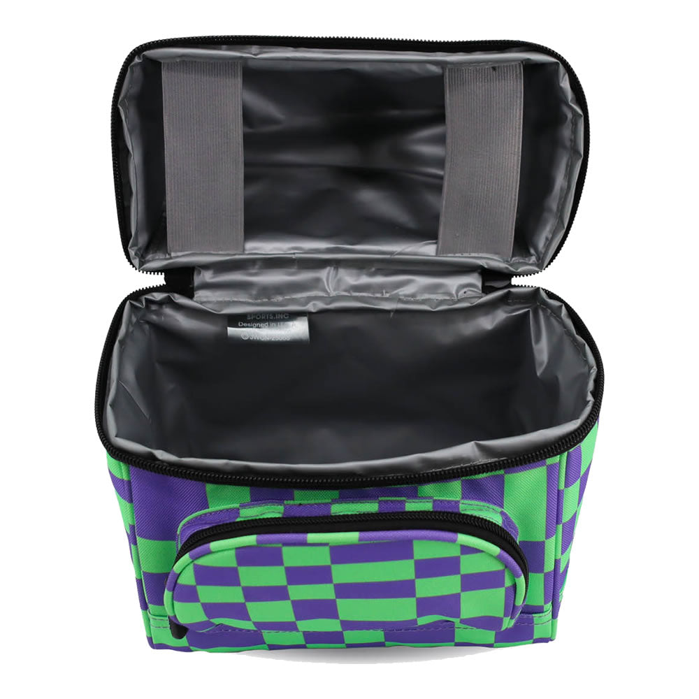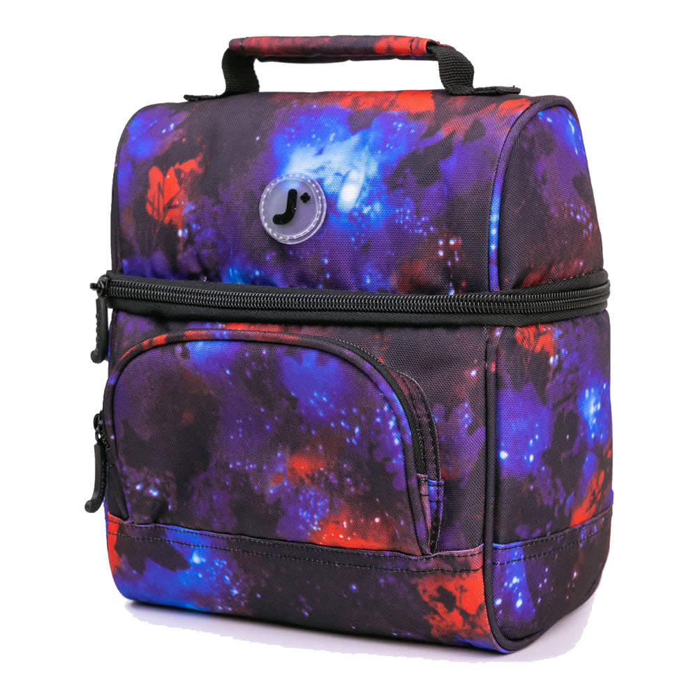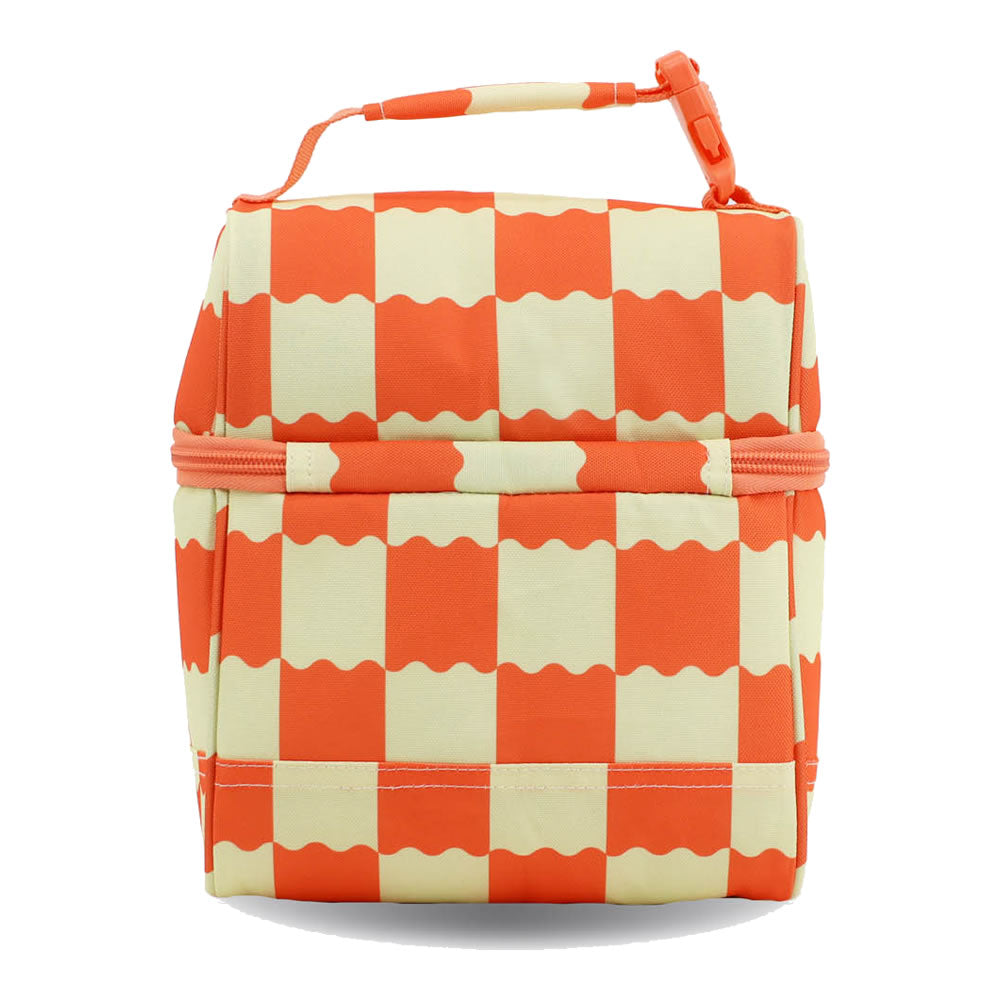 Compartimento principal para contenedores de comida Bolsillo frontal para cubiertos Asa superior con hebilla Correa interior para sujetar botella de agua Asa con hebilla para sujetar a una mochila