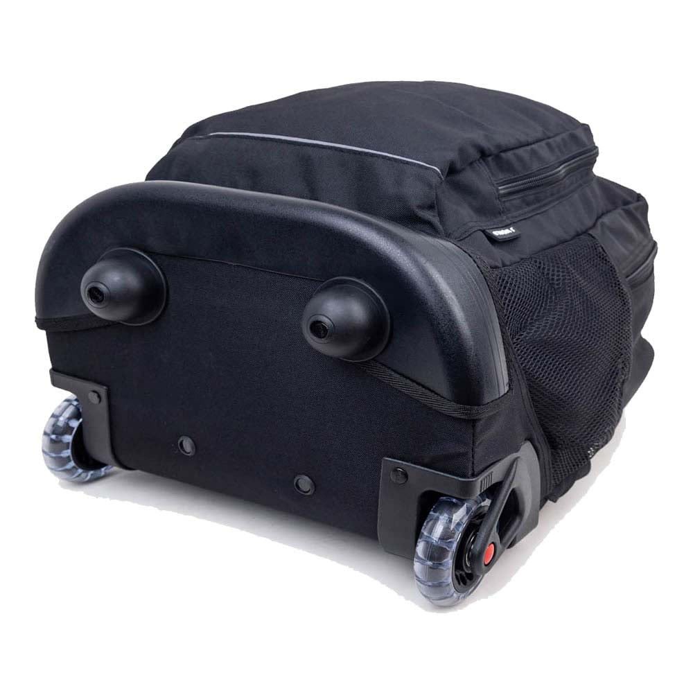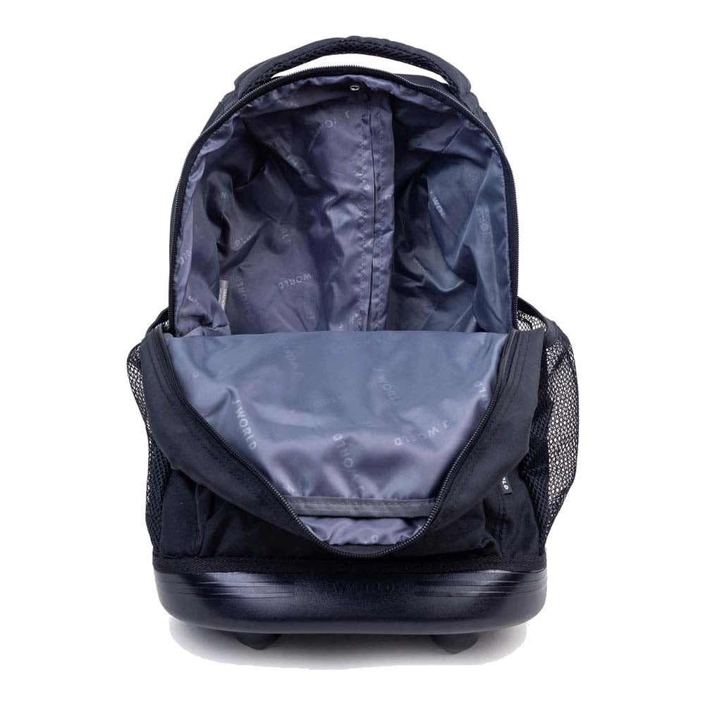 Molde inferior a juego para protección Organizador en el bolsillo frontal con porta lápiz, llavero y bolsillo con cierre Manija retráctil de tres etapas con sistema de bloqueo, botón de empuje y agarre acolchado Bolsillos laterales de malla para botella de agua Tirantes y respaldo acolchados con sistema deslizante Amplio compartimento principal Ruedas suaves y silenciosas para un movimiento estable y controlado Diseñado para caber debajo del asiento del avión o en el compartimento superior