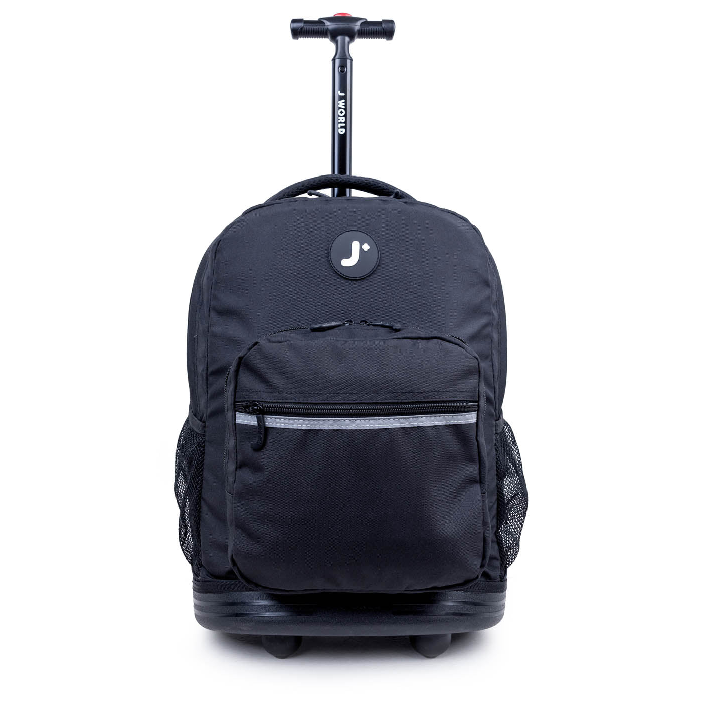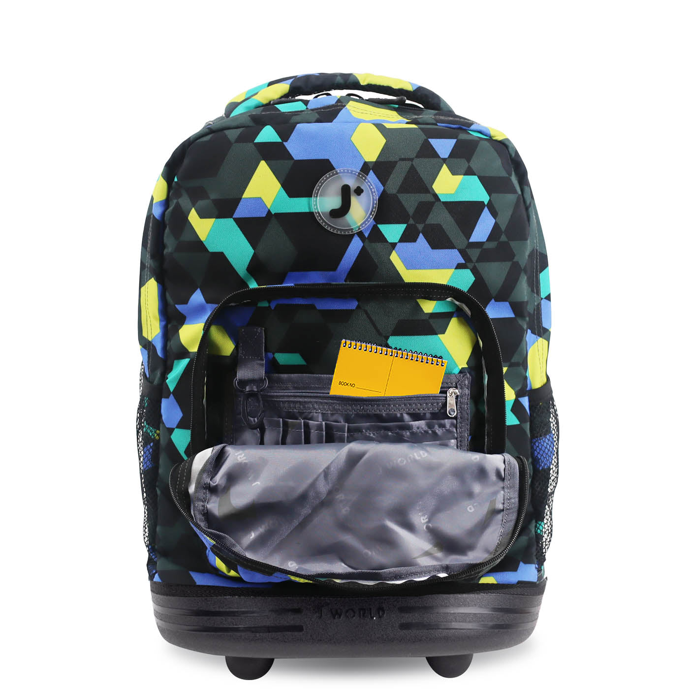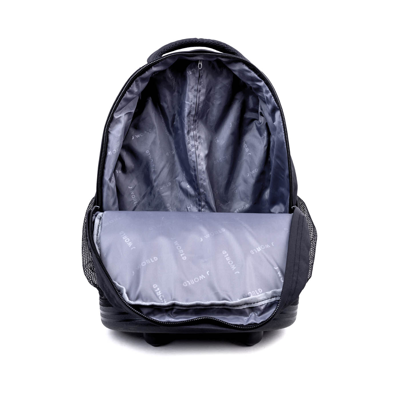 Molde inferior a juego para protección Organizador en el bolsillo frontal con porta lápiz, llavero y bolsillo con cierre Bolsillos laterales de malla para botella de agua Diseñado para caber debajo del asiento del avión o en el compartimento superior Ruedas con logo “J” Forro interior con acabado de cierre Tirantes y respaldo acolchados con malla de aire y sistema deslizante