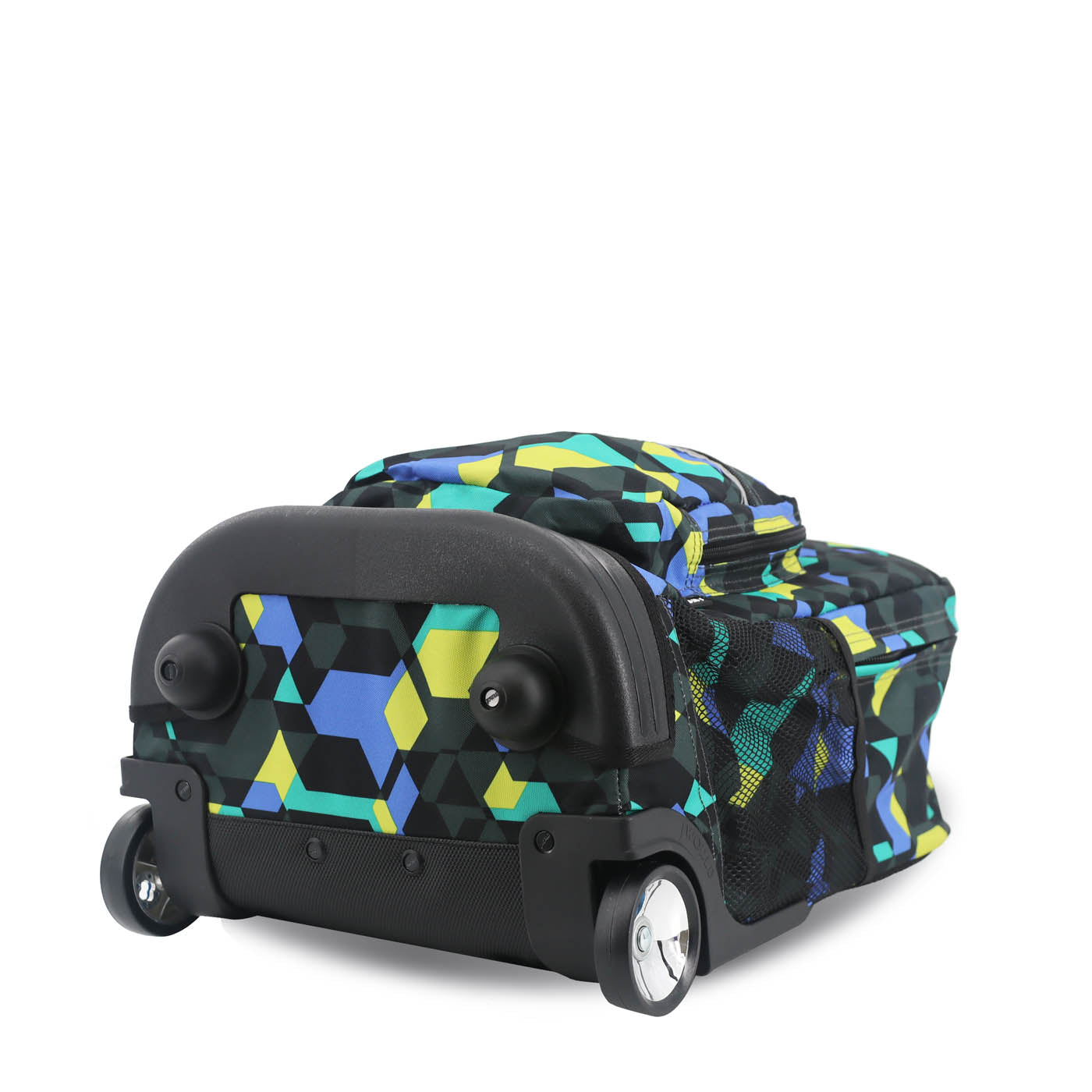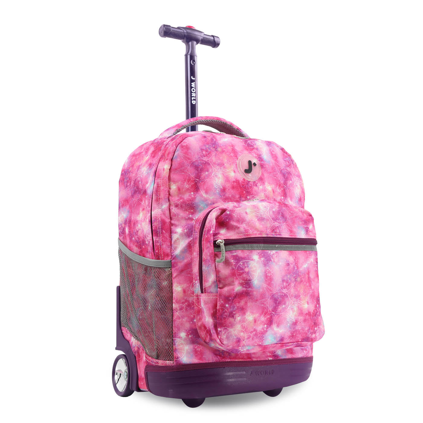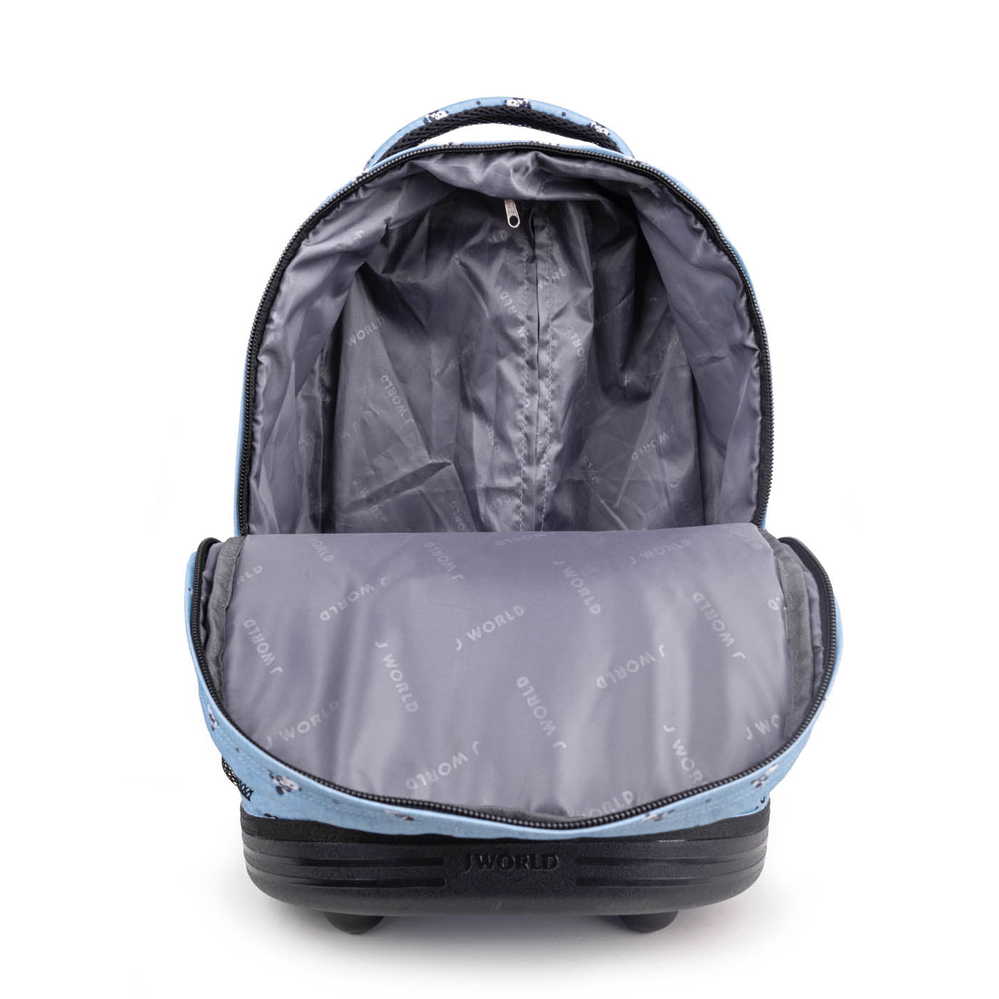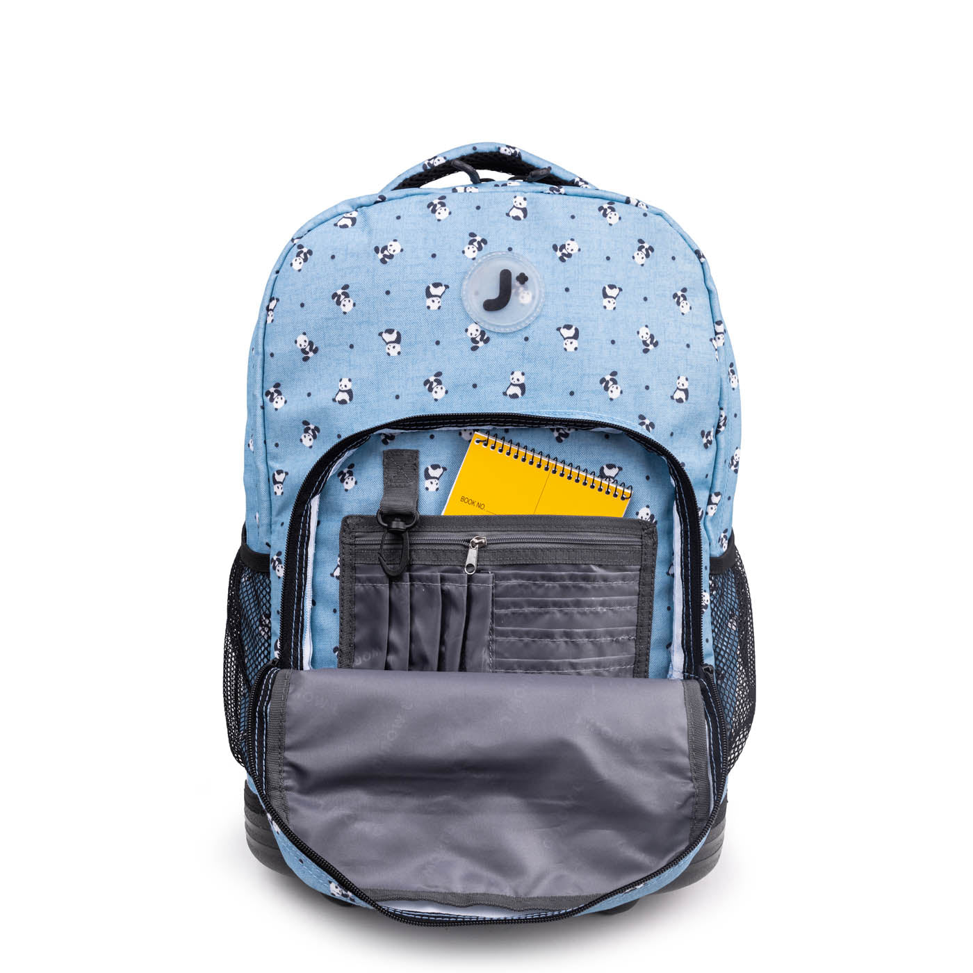 Molde inferior a juego para protección Organizador en el bolsillo frontal con porta lápiz, llavero y bolsillo con cierre Bolsillos laterales de malla para botella de agua Diseñado para caber debajo del asiento del avión o en el compartimento superior Ruedas con logo “J” Forro interior con acabado de cierre Tirantes y respaldo acolchados con malla de aire y sistema deslizante